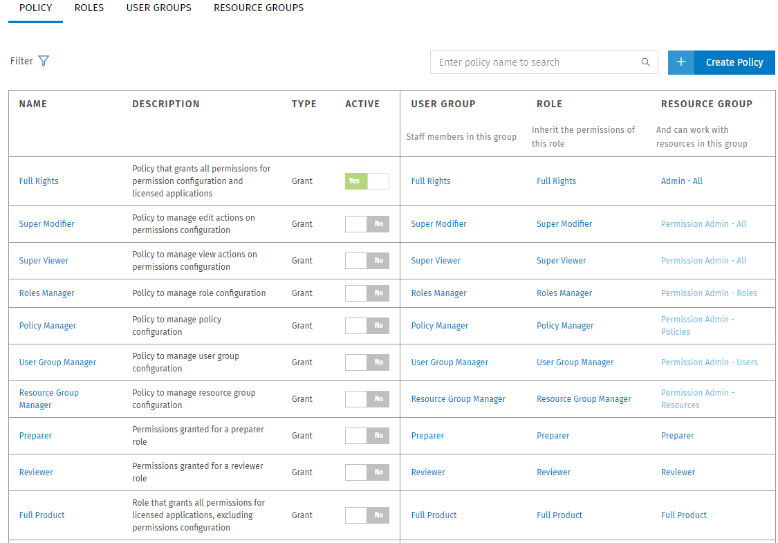 The Permissions Platform allows Firm Administrators to set up policies so that only authorized users can make changes to each client's engagement. A policy is made up of a user group, role, and resource group. The permission policy determines which functional rights users have and which clients (resources) they can work with.