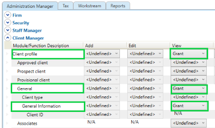 Under the Client profile module > Select Grant in the View column