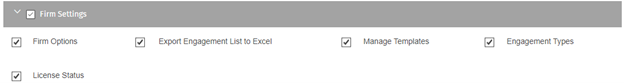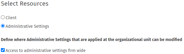 Select "Access to administrative settings firm wide" to provide staff access to Firm Settings such as: