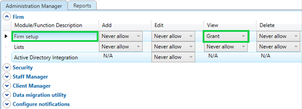 Firm administrators can grant or deny staff members access to perform the following actions in the application:
